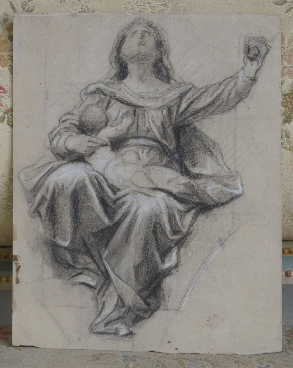 Scuola italiana del secolo XIX "Madonna con bambino" matita nera e biacca su carta (mm 310x245) (difetti)