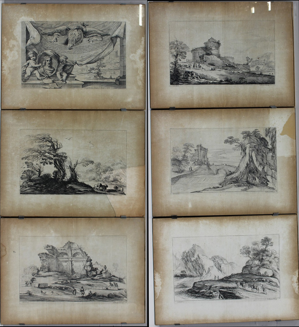 Giovanni Francesco Barbieri. "Capricci" serie di quattordici incisioni più una di frontespizio di dedica al duca di Modena da parte degli eredi Benedetto e Cesare Genari, incise da Gio Penna a Parigi (cm 42x56) in cornici picoglass (difetti)