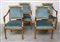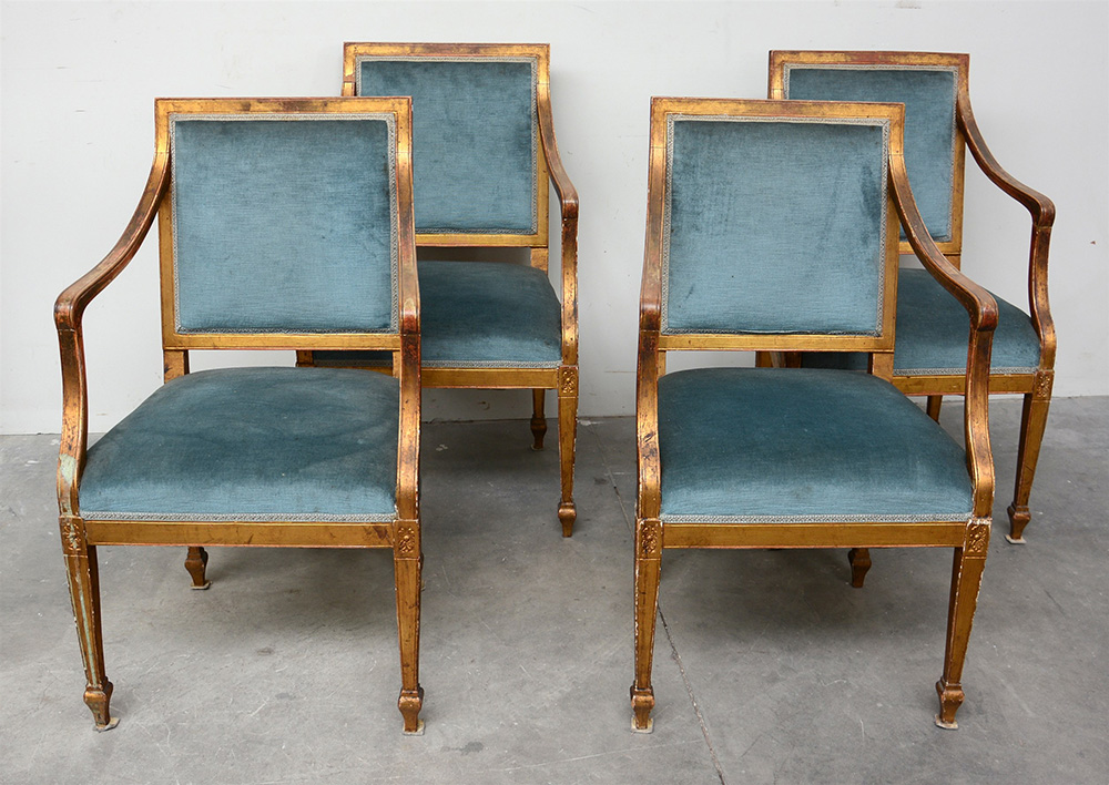 Gruppo di quattro poltroncine in legno dorato con profili unghiati, braccioli mossi e gambe rastremate, sedute e dorsali in velluto azzurro (difetti)
