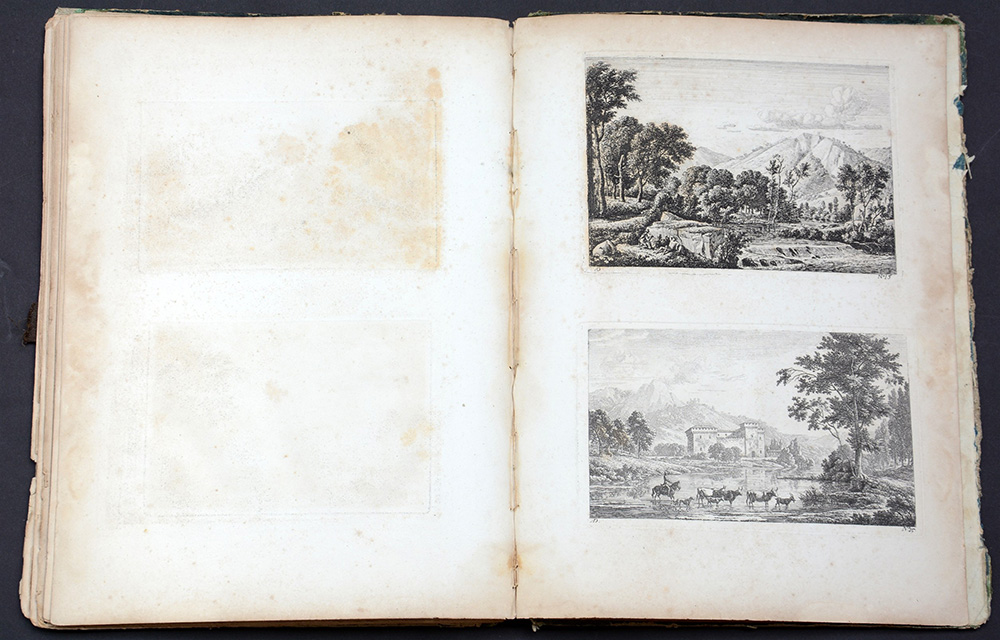 Raccolta di incisioni, soprattutto vedute e paesaggi, un ritratto, entro legatura in cartone (legatura compromessa, difetti).