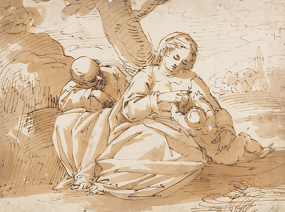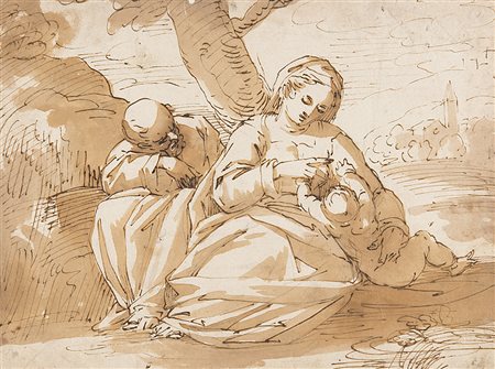 Seguace di Luca Cambiaso "Riposo durante la fuga in Egitto" penna e inchiostro bruno acquerellato in bruno su tracce di matita nera (mm 185x250)