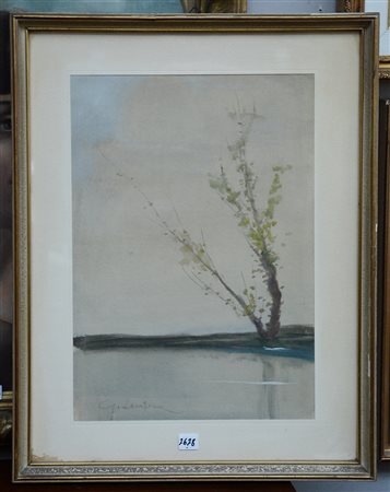 "Paesaggio lacustre" acquerello e tempera su carta (cm 41x29) firmato in basso a sinistra, in cornice (lievi difetti)