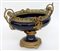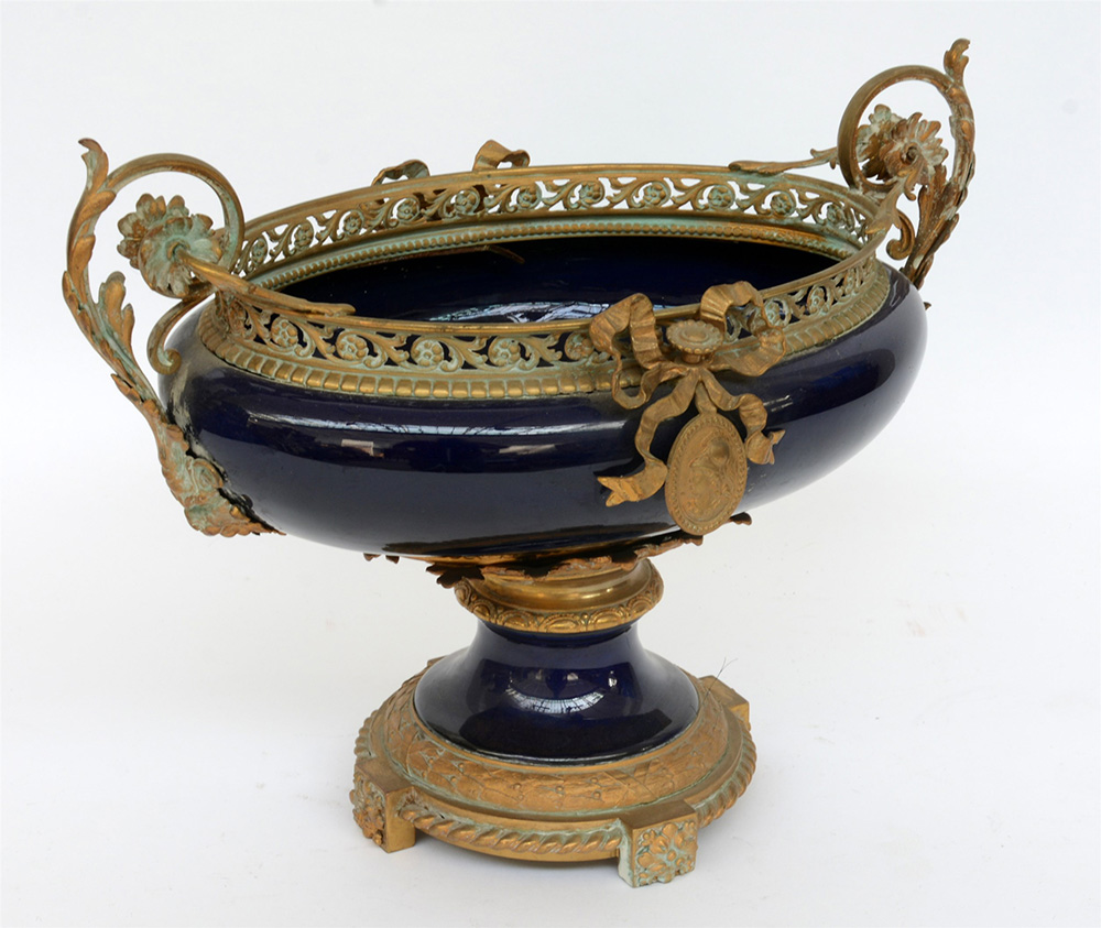 Centrotavola biansato in bronzo dorato e porcellana blu decorato da foglie, volute e due fiocchi con medaglioni, fine secolo XIX (h cm 29) (difetti)