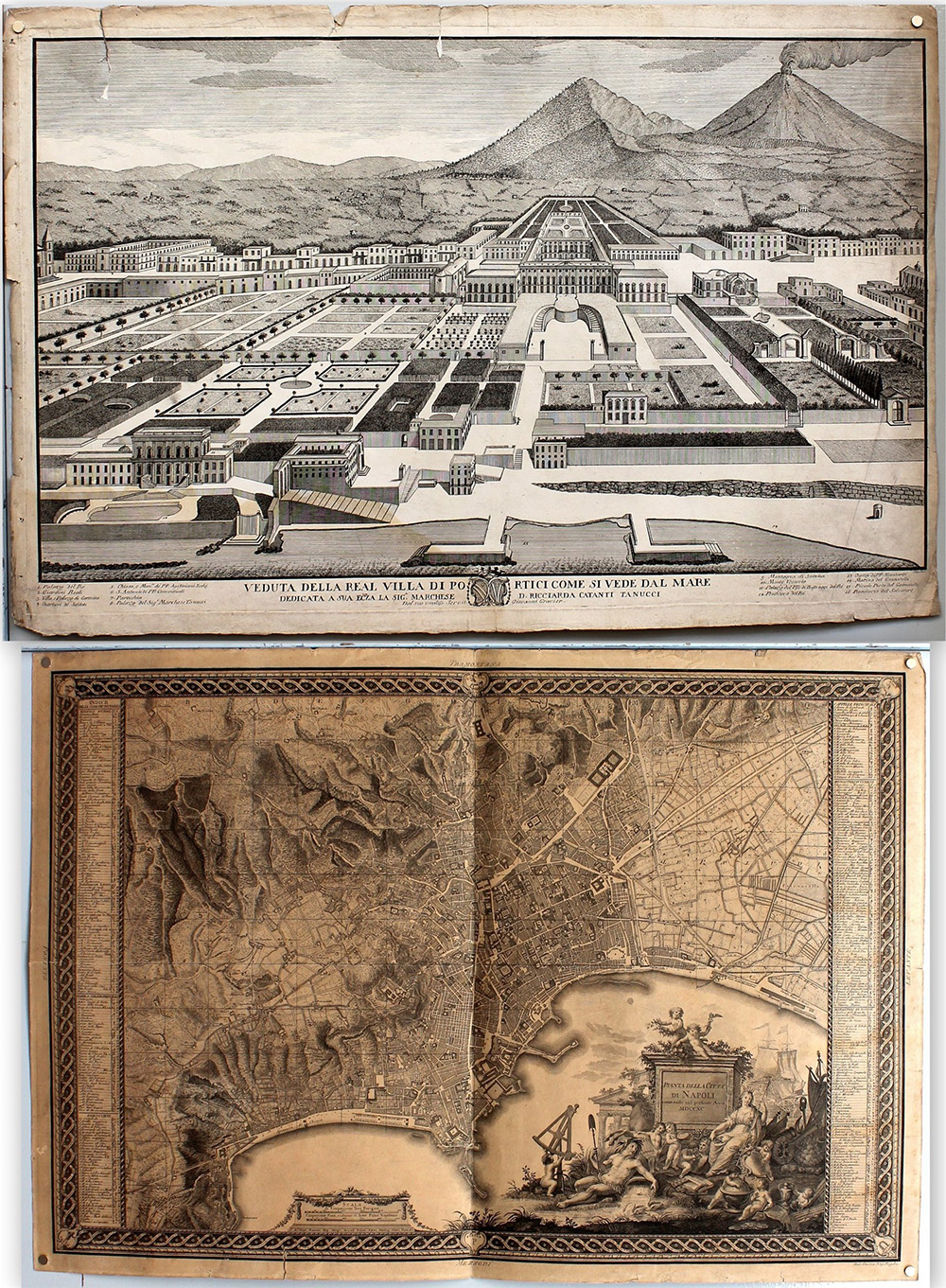 Due incisioni di diversa epoca raffiguranti vedute di Napoli e portici
