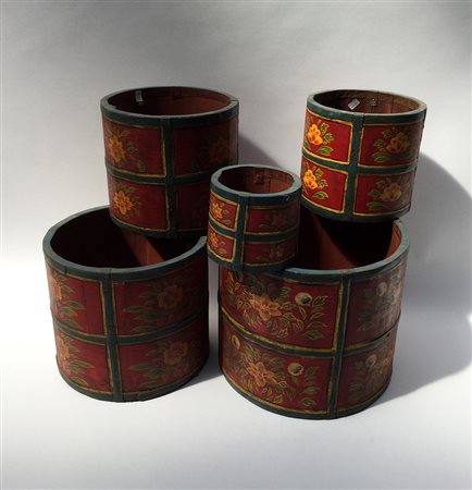 Serie di cinque contenitori di manifattura orientale in legno dipinto (h max...