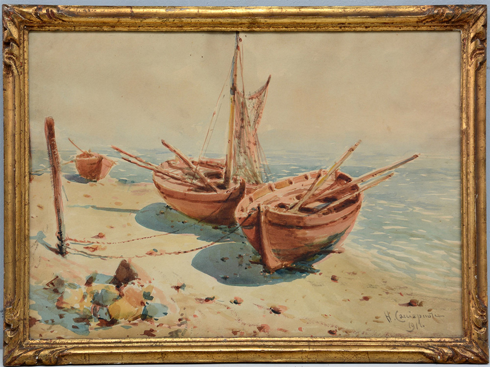 Cacciapuoti "Barche" acquarello (cm 33x45) firmato e datato 1914 in basso a...
