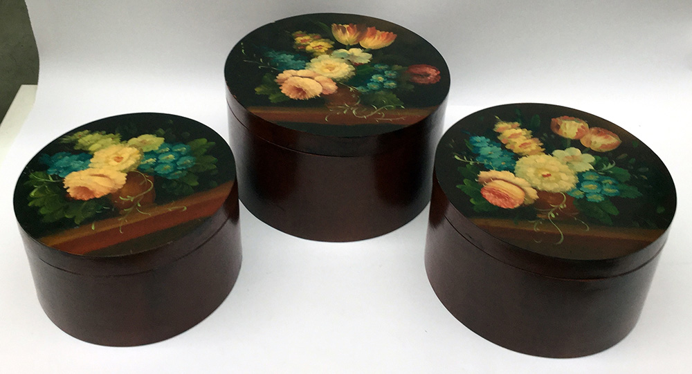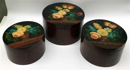 Serie di dieci scatole a 'matrioska' in legno dipinto a fiori (cm max 22x38)