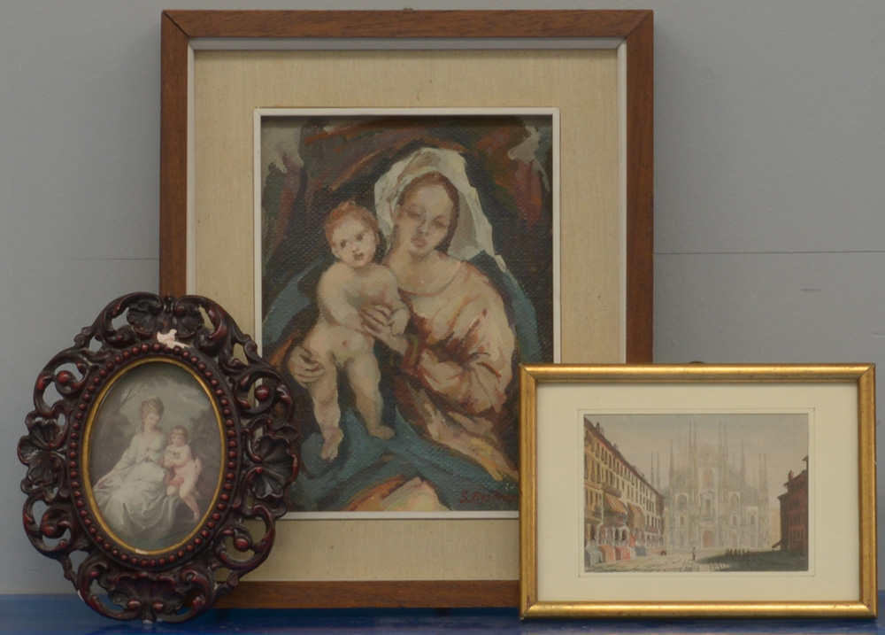 Lotto composto da un dipinto ad olio raffigurante Madonna con Bambino firmato G. Rossini, una cornicetta ovale contenente una riproduzione ed una stampina raffigurante il Duomo di Milano (difetti)