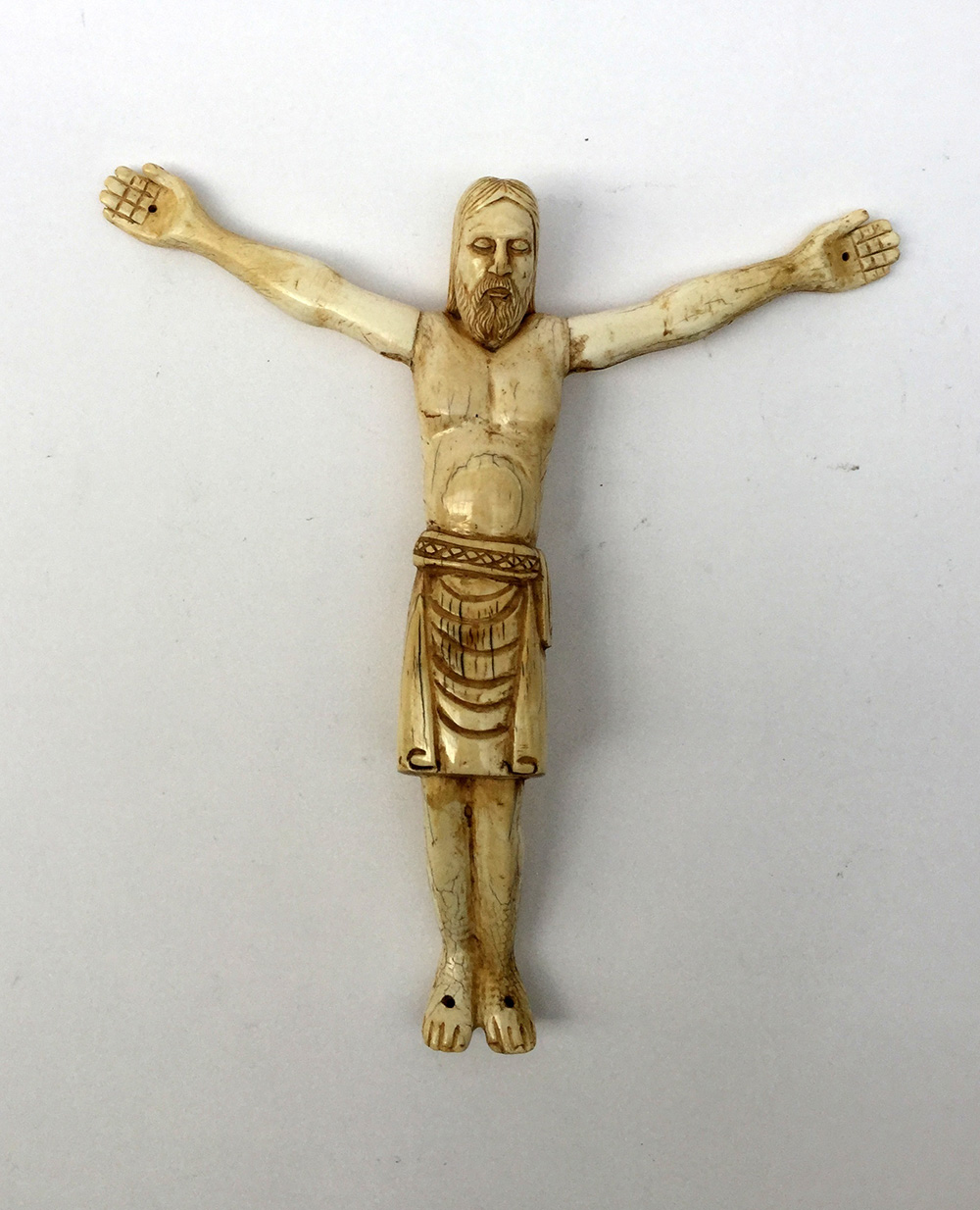 Antico cristo crocifisso di gusto romanico in avorio (cm 29)