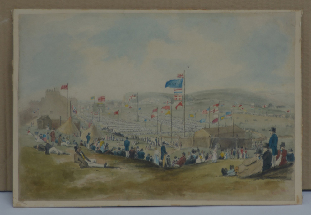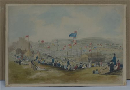 Scuola inglese del secolo XIX "Raduno" acquerello su carta (cm 27x40) iscritto al retro