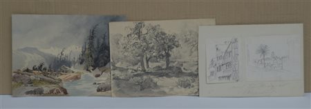 Lotto composto da un acquerello e tre disegni a matita di diverso autore ed epoca