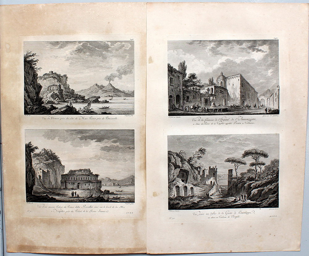 Cartella contenente numerose incisioni del sec XVIII/XIX raffiguranti scorci e vedute di Napoli, Posillipo, Salerno