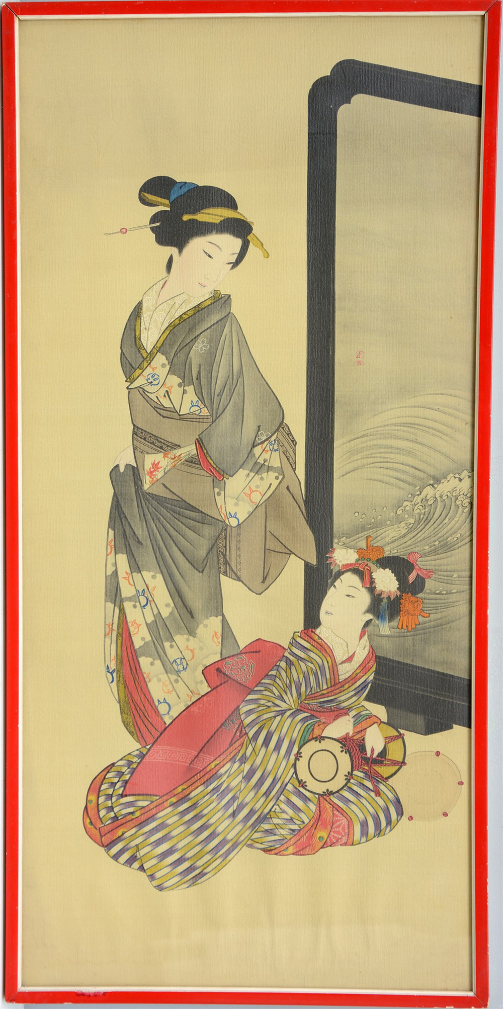 Arte orientale, stampa a colori raffigurante figure femminili, in cornice