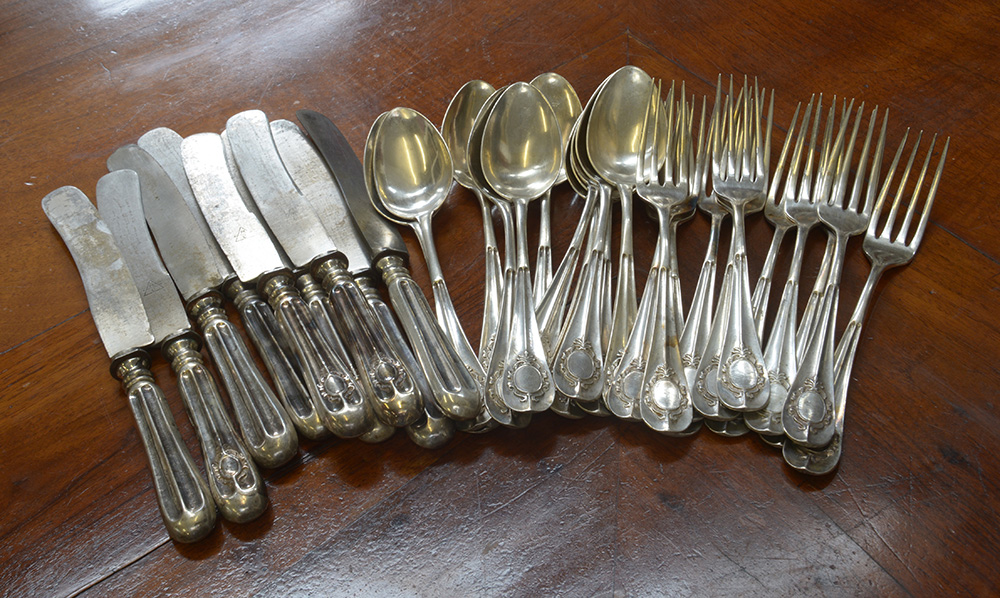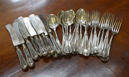 Servizio di posate in argento composto da undici cucchiai, undici forchette e nove coltelli tavola. Probabile manifattura italiana, fine secolo XIX (g 1700 ca.) (difetti)