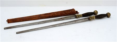 Coppia di mazze in metallo, contenute in fodero gemello in cuoio. Asia, sec. XIX (l. cm 65) (difetti)