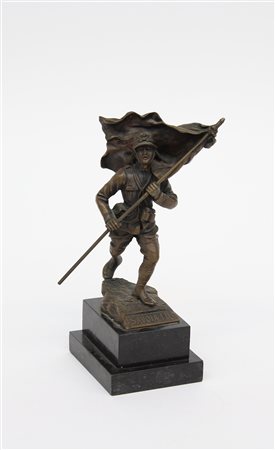 Scultura in bronzo raffigurante Alfiere di Fanteria, Italia, sec. XX (h cm 24) alla base il motto "Savoia" e firmata M. Guelfi (difetti e mancanze)