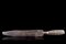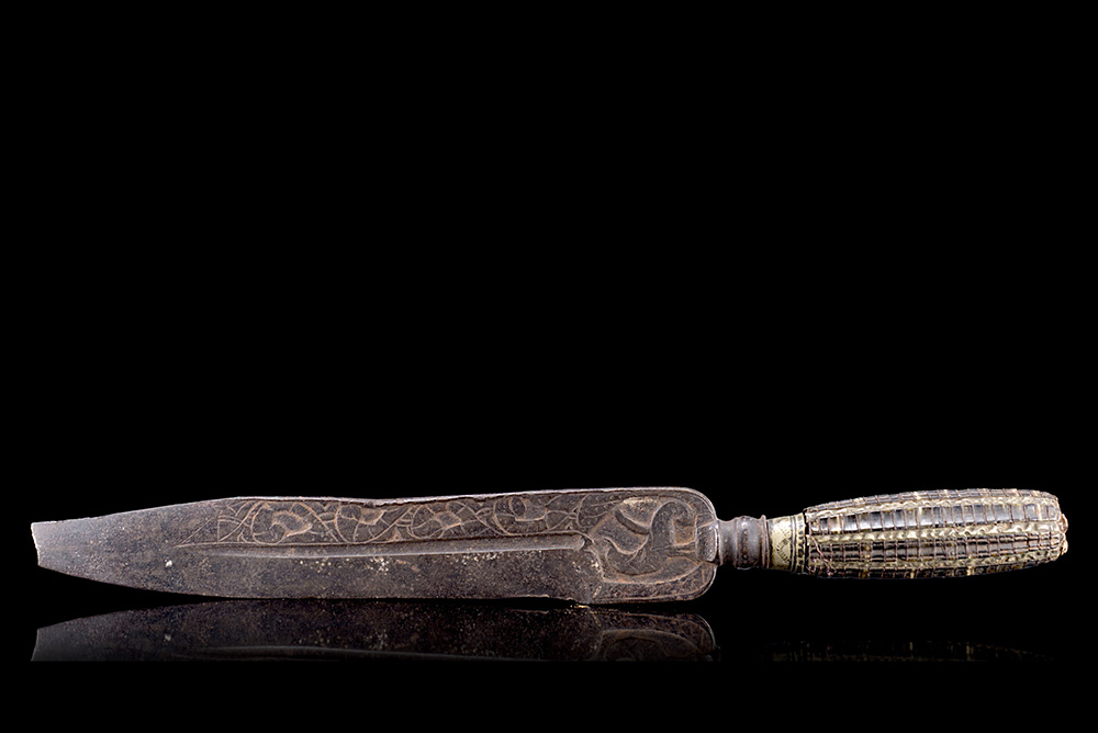 Forte coltello da caccia con manico periforme a dischi di corno sovrapposti. Forte lama scolpita con animali fantastici al tallone. Punta spezzata. Italia meridionale, Calabria, fine sec. XVIII