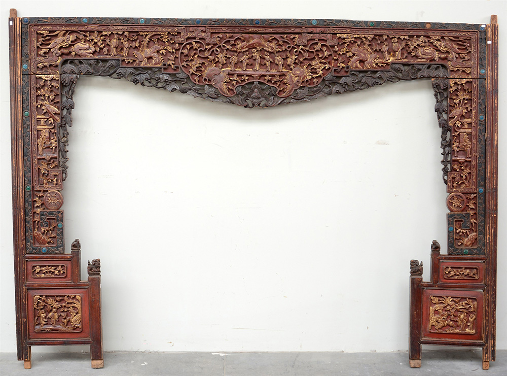 Cornice per porta in legno scolpito e laccato con dorature (difetti e...