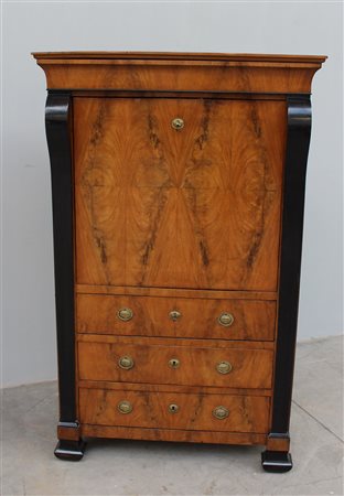 Secretaire lastronato in radica di noce ad un cassetto sottopiano e tre nella base. Anta ribaltabile celante scarabattolo con cassettini e vani. Montanti sagomati in legno ebanizzato. Sec. XIX (cm 103x165x49)