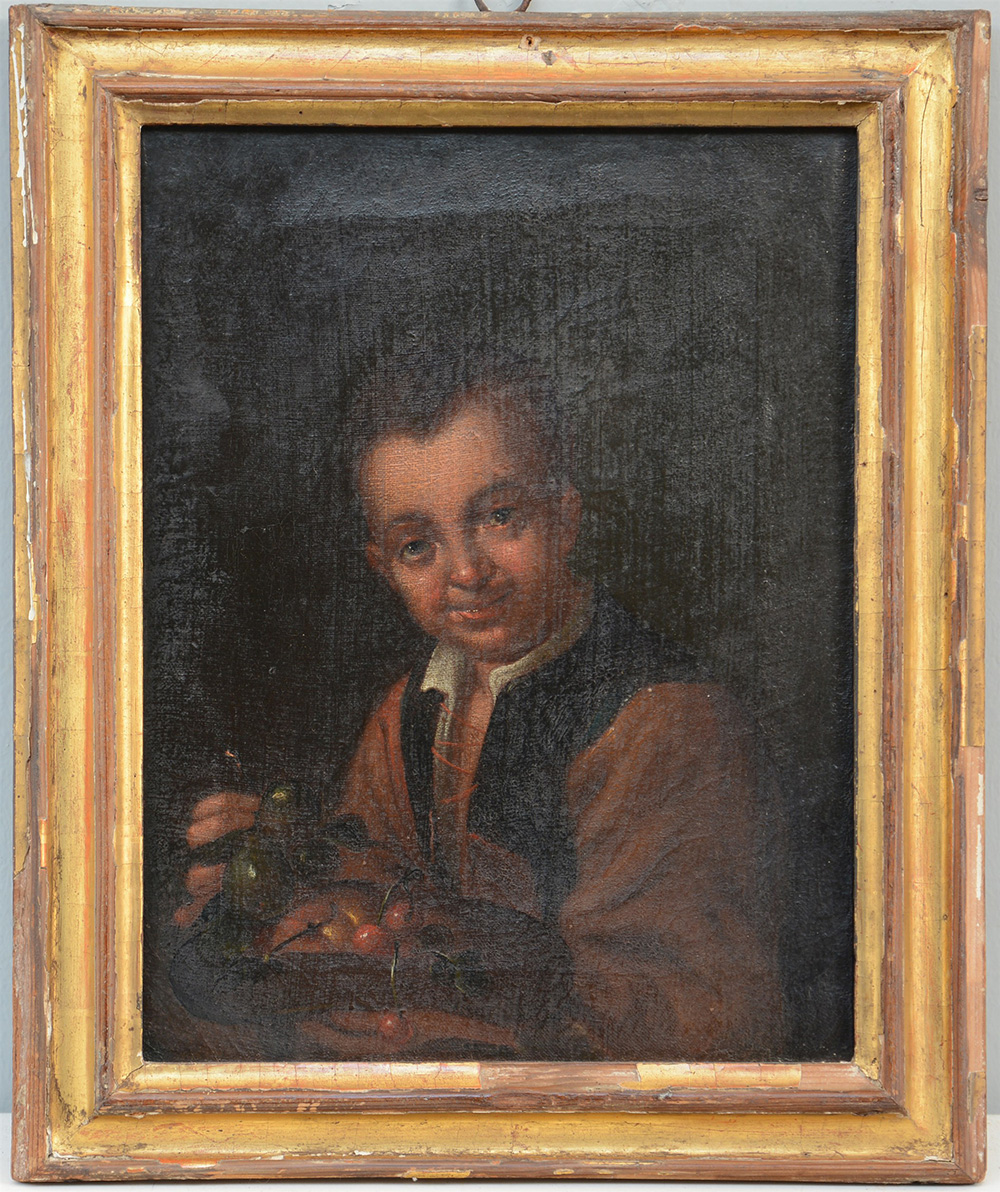 Ambito di Antonio Amorosi, secolo XVII "Fanciullo con frutta" olio su tela (cm 32x24) (difetti)