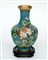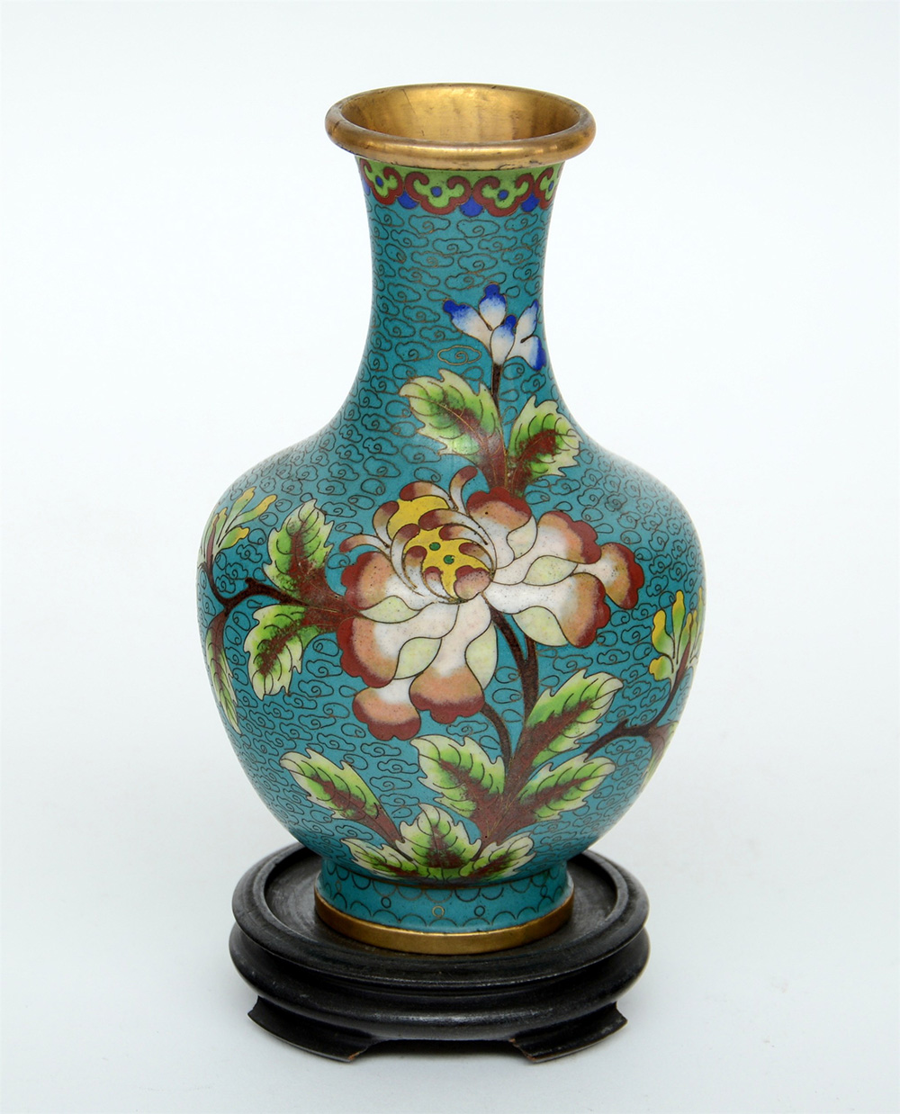 Piccolo vaso in metallo cloisonné a decoro floreale su fondo turchese, base on legno.