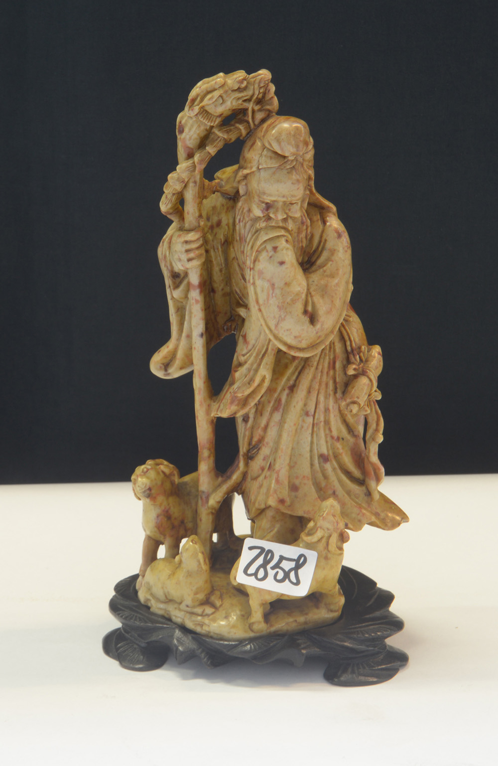 Scultura in pietra saponaria raffigurante un saggio con capre, base in legno (lievi difetti)