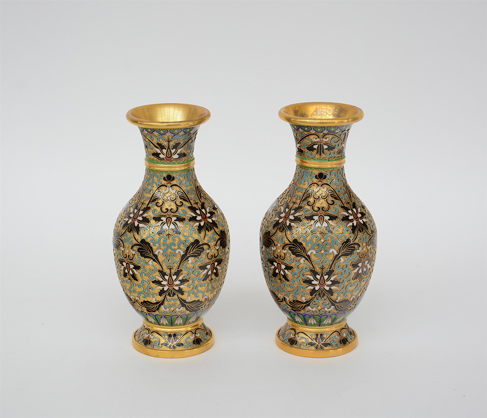 Coppia di vasi in metallo cloisonné a decoro floreale (difetti)