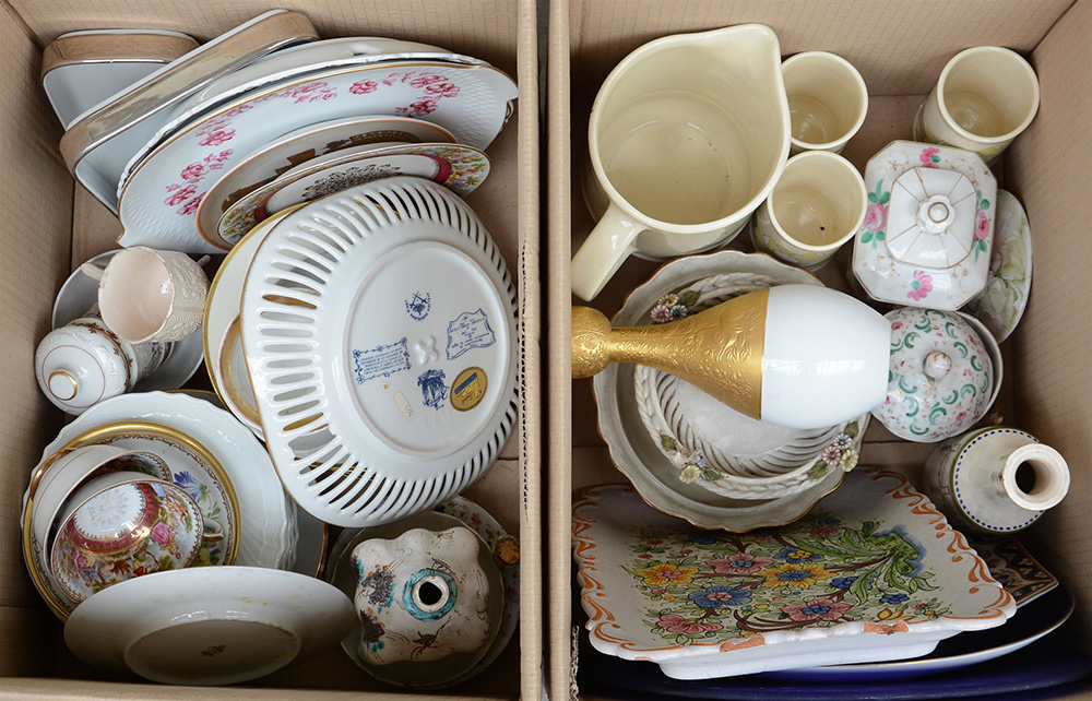 Lotto di due cartoni contenenti numerosi oggetti in ceramica per la tavola...