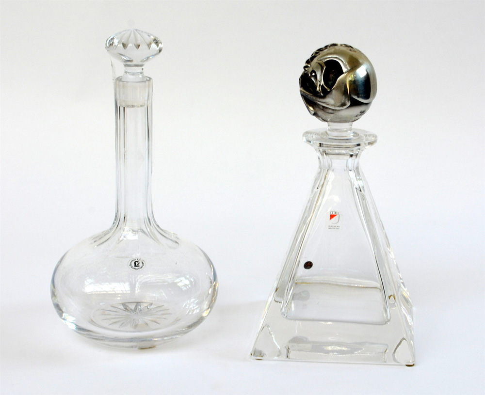 Lotto composto da una bottiglia in cristllo molato con tappo in argento marcato "Ottaviani" e titolato "800", unita a una bottiglia in cristallo molato marcata "Lambert" sotto la base. Seconda metà secolo XX.