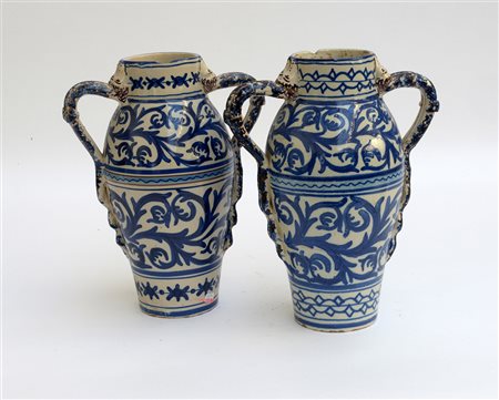 Coppia di vasi biansati in maiolica con decorazione a girali fogliati e fasce geometrizzanti in monocromia blu (h. cm. 30). Italia meridionale, XIX secolo (difetti e mancanze)