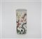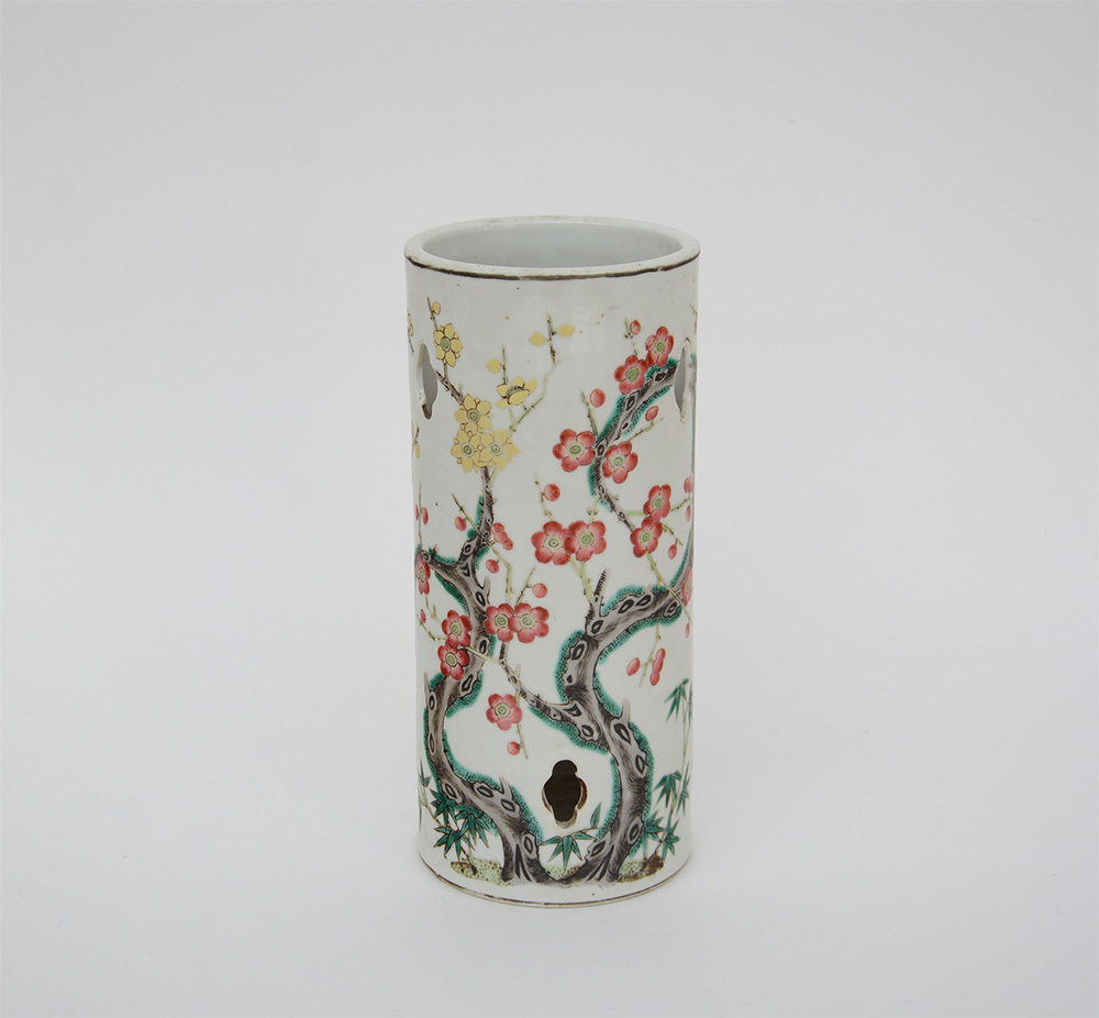 Vaso cilindrico in porcellana a smalti policromi con rami in fiore, marchio apocrifo sul fondo (difetti)