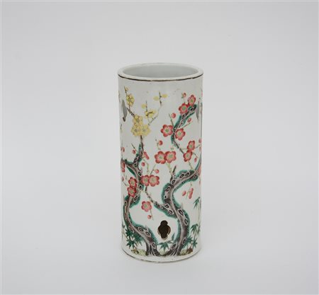 Vaso cilindrico in porcellana a smalti policromi con rami in fiore, marchio...