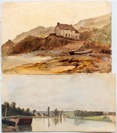 Ignoto "Paesaggi" due dipinti ad olio su tela e carta (misure diverse) (difetti)