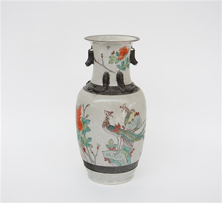 Vaso in porcellana craquelê decorato in smalto Famiglia Verde con fiori e uccelli, marchio apocrifo alla base (difetti)
