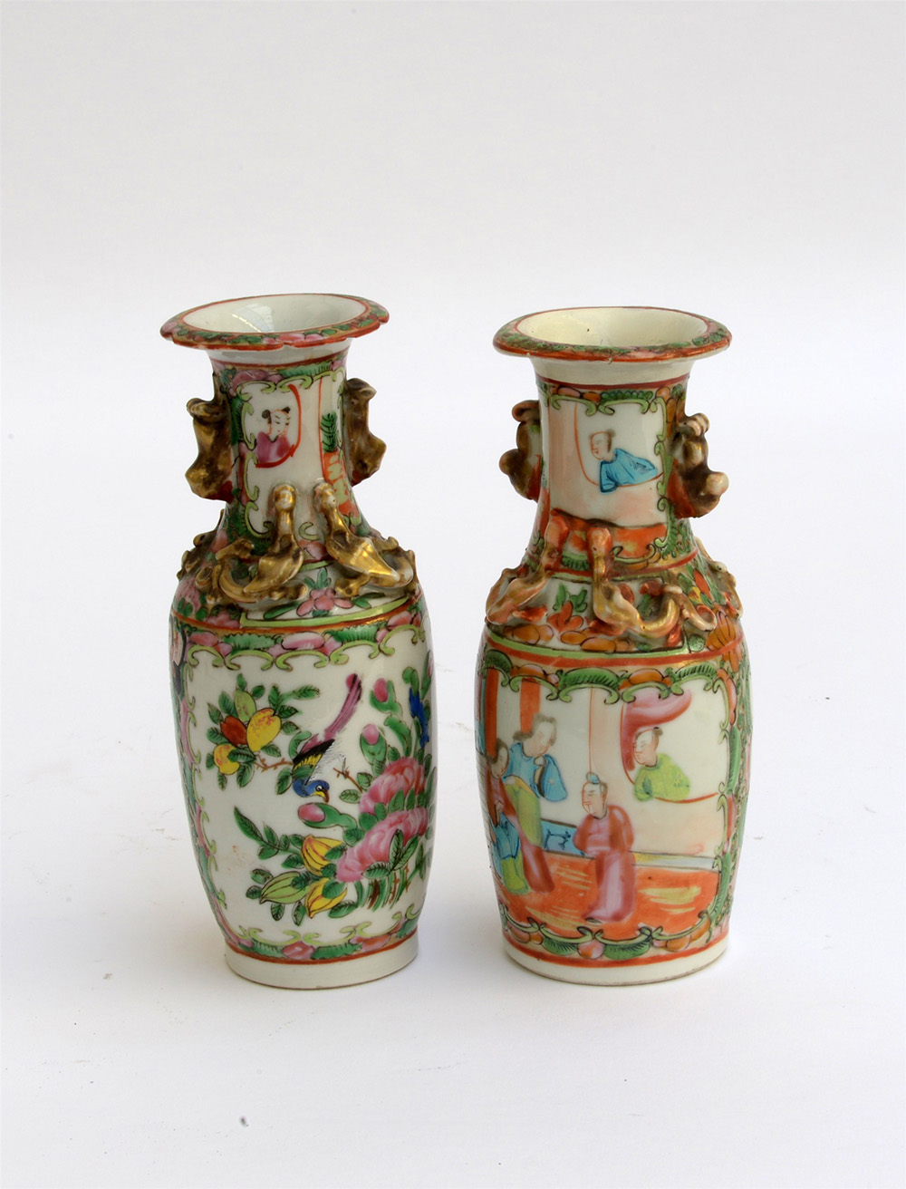 Manifattura di Cina. Due vasetti in porcellana Famiglia Rosa cantonese decorati con figure e volatili tra fiori e scene di vita (difetti)