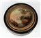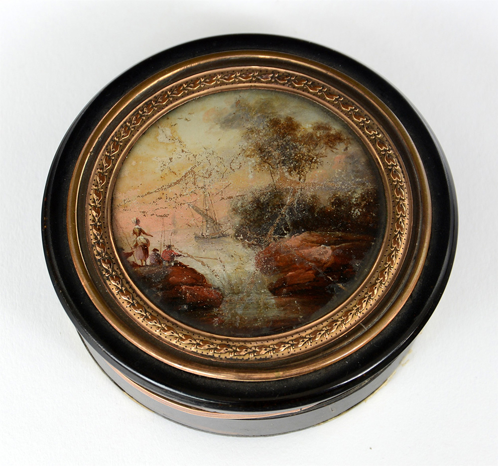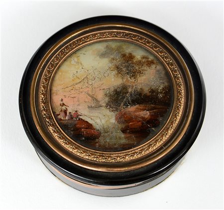 Tabacchiera di forma tonda con coperchio decorato con miniatura raffigurante paesaggio fluviale con barche e pescatori. Cornice e ghiera in oro basso. Sec XVIII (d cm 8,5) (difetti e mancanze)