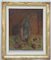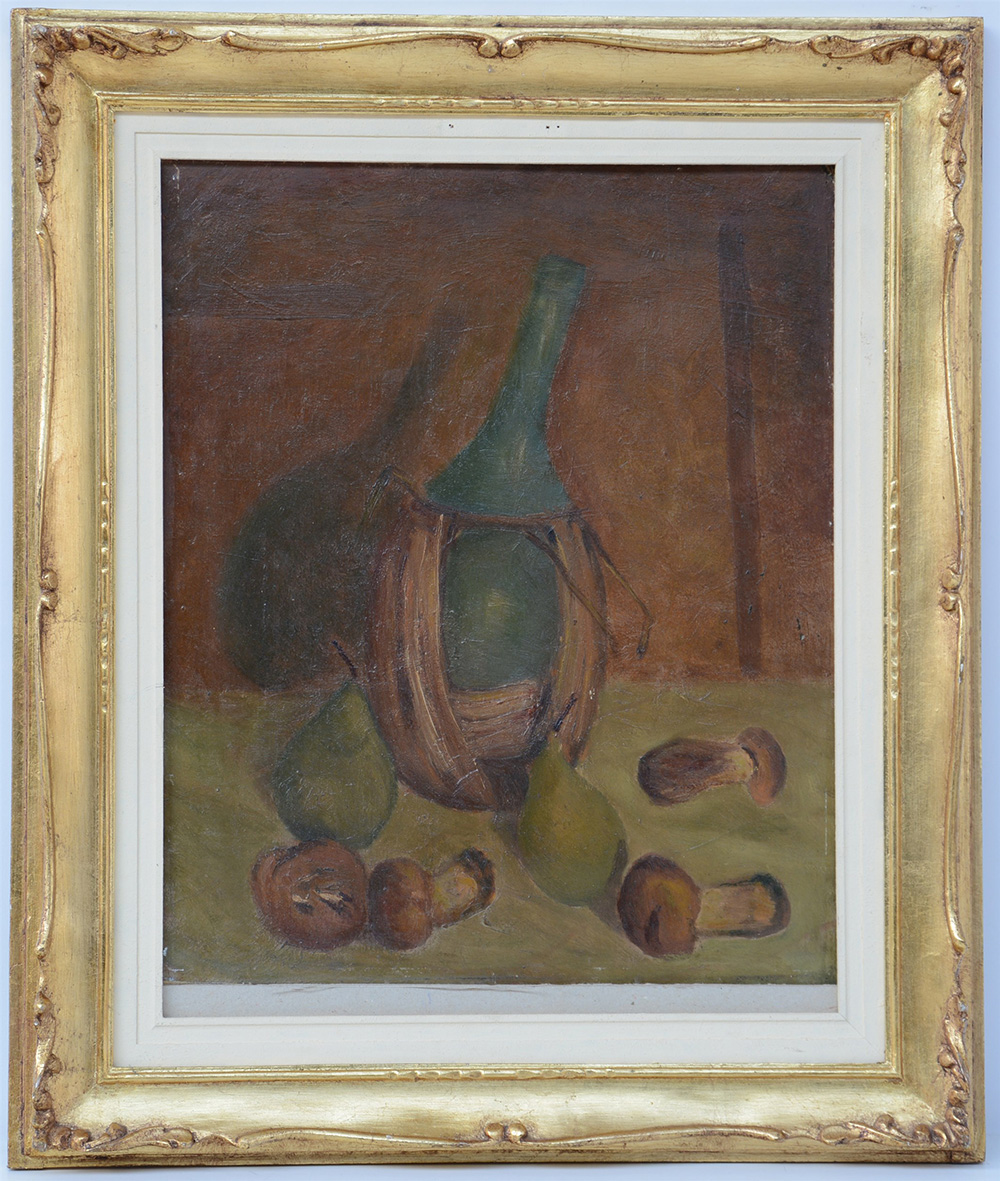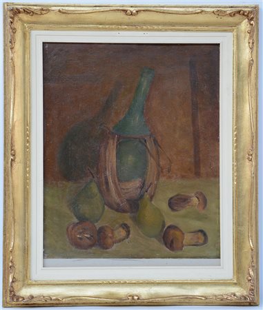 Ignoto, "Natura morta con fiasco e funghi" olio su compensato (cm 50x39) vecchia attibuzione a Walter Pozzi sul retro, in cornice