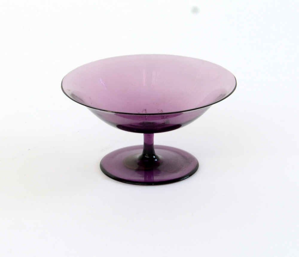 Coppetta in vetro soffiato ametista trasparente. Prima metà secolo XX. In scatola non pertinente.