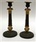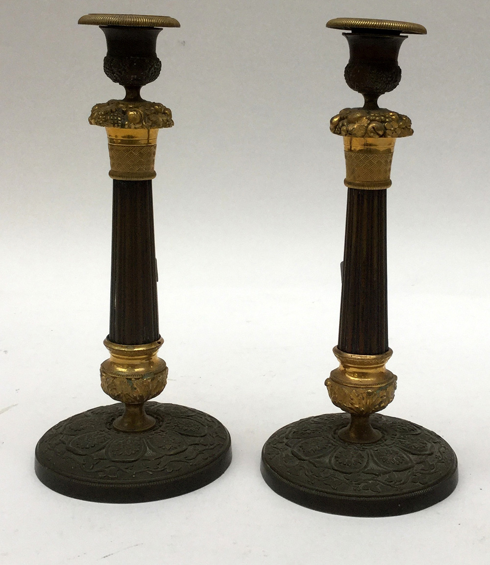 Coppia di candelieri in metallo brunito e dorato decorati in rilievo, corpo scanalato (h cm 26)(difetti)
