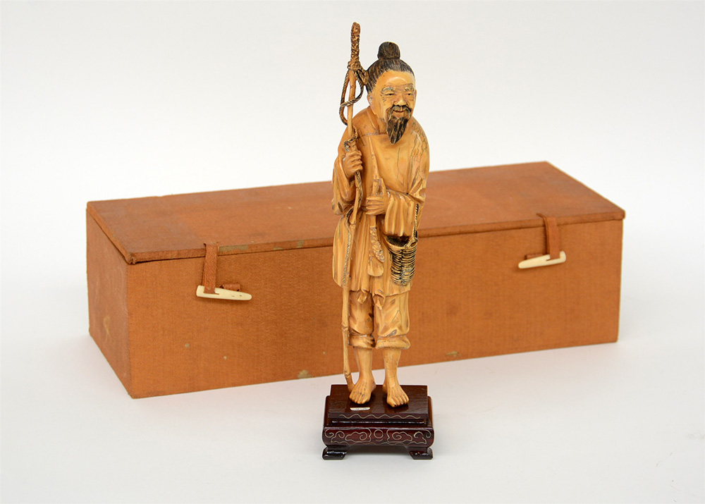 Okimono in avorio raffigurante pescatore, base in legno, scatola originale (difetti)