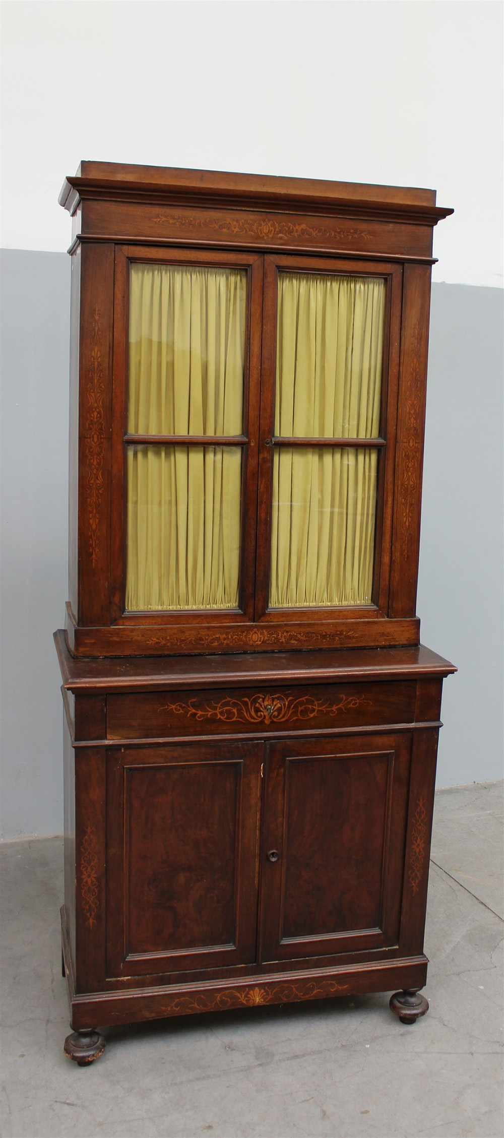 Mobile vetrina a due corpi in mogano intarsiato a motivi vegetali, parte superiore a due ante a vetri, parte inferiore ad un cassetto nella fascia e due ante riquadrate. Piedi a cipolla. Sec. XIX (cm 94x215x50)(difetti)