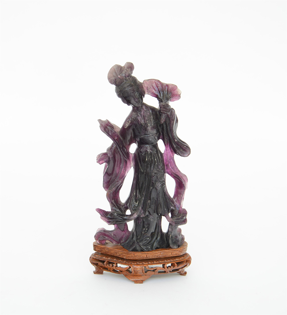 Scultura in ametista raffigurante donna dalle lunghe vesti, base in legno (difetti)