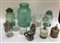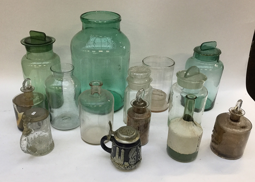Tre scatole con un lotto di contenitori in vetro, di cui uno grande, e un boccale in ceramica (difetti)