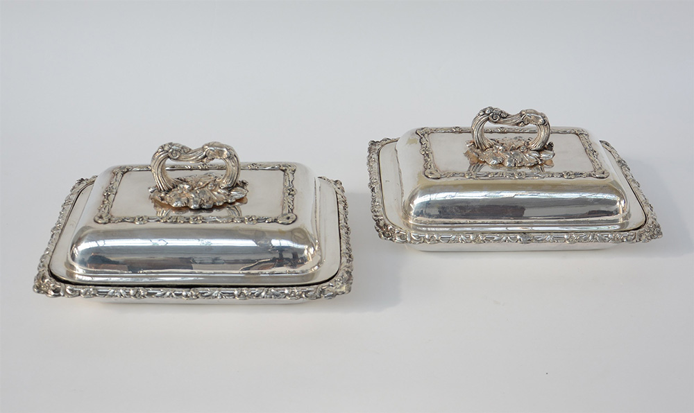 Coppia di legumiere con coperchio in Sheffield decorate a motivi vegetali in...