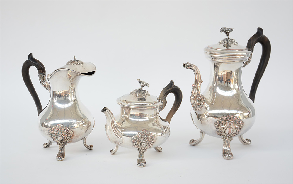 Servizio da the e caffè in Sheffield composto da teiera, caffettiera e lattiera decorato a volute in rilievo, con manici in legno (lievi difetti e mancanze)