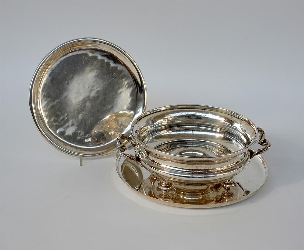 Scaldavivande biansato in metallo argentato con vassoio e piatto non pertinenti (d cm 30, h cm 11) (difetti)
