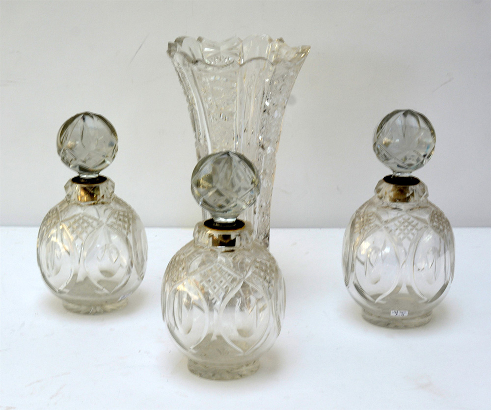 Gruppo di tre boccette con coperchi e un vaso in cristallo molato, anni ‘50/60 del secolo XX (h max cm 25) (difetti)