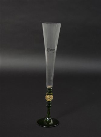 Vaso a calice in vetro soffiato verde e oro. Murano, anni '70'/80. Firmato all'acido sotto l base.