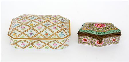 Lotto di due scatoline con coperchio in porcellana decorata in policromia, manifatture differenti (lievi difetti)