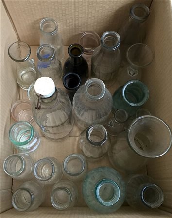 Scatola contenente numerose misure in vetro di diversa epoca e fattura
